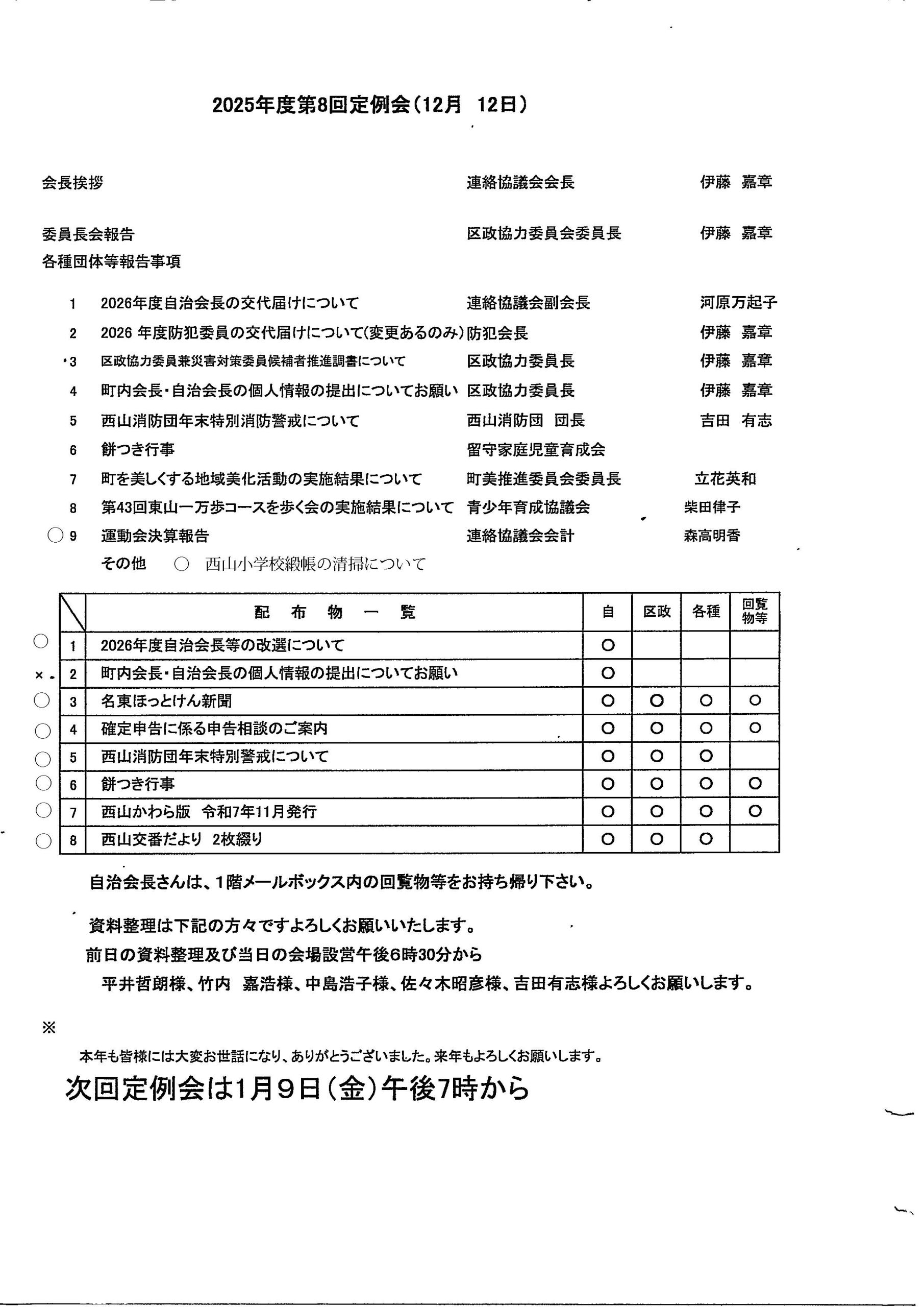 4) 令和8年度学区関係自治会役員の交代届締切り:保健環境委員(1月26日)、自治会長、区政協力委員、防犯委員、体育委員(2月21日);保健環境委員は林 靖人様が継続を了承されています。