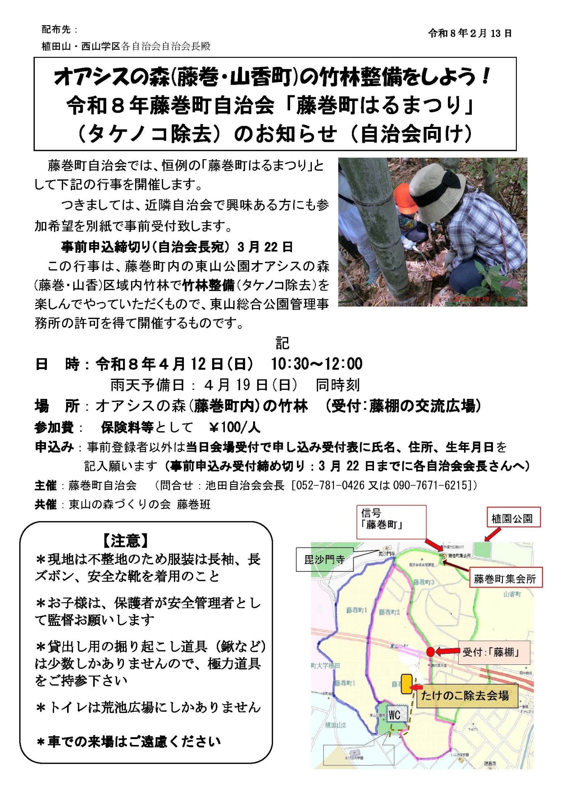 「藤巻町はるまつり」竹林整備(タケノコ除去)のお知らせ 2026年3月10日 wpmaster 今年も藤巻町自治会では、NPO法人 東山の森づくりの会 藤巻班と共同で、東山公園オアシスの森(藤巻・山香の森)の竹林整備を行います。詳細は下記のチラシをご覧ください。一般向けは4月12日(日)です。大雨の時は中止とし、19日(日)に順延します。保険料等100円を当日徴収いたします。