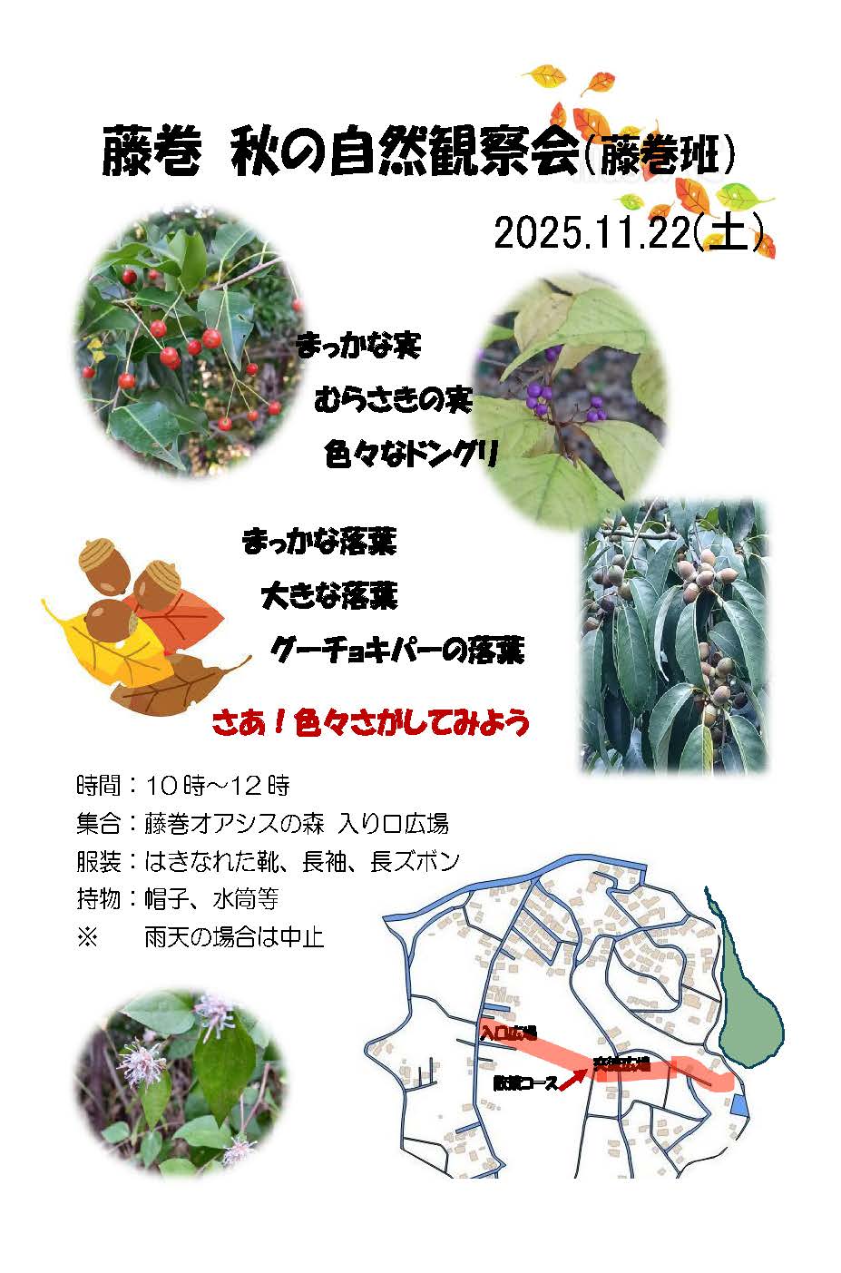 令和7年11月22日(土)午前10時から12時(予定)で、藤巻町と東山森づくりの会藤巻班では東山公園 藤巻・山香の森で、オアシスの森自然観察会を開催します。参加費無料(小雨決行です)