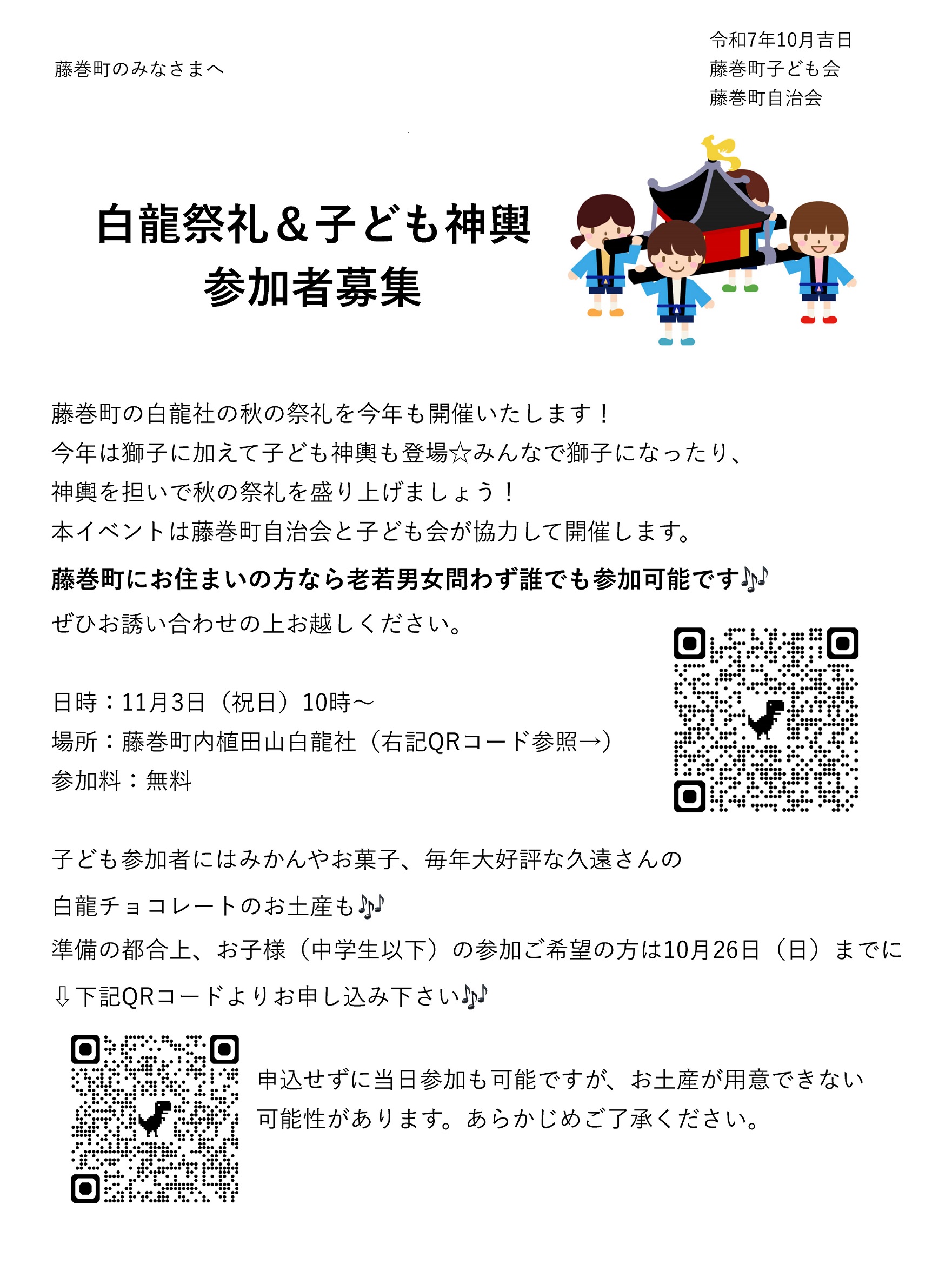 令和7年11月3日 植田山白龍社の秋の祭礼があります 2025年10月27日 wpmaster 令和7年11月3日(月・祝) 植田山白龍社の秋の祭礼があります 下記の通り例年通りの子ども獅子に追加して、名東本通東自治会さんから譲り受けた子ども神輿の巡回も行います。