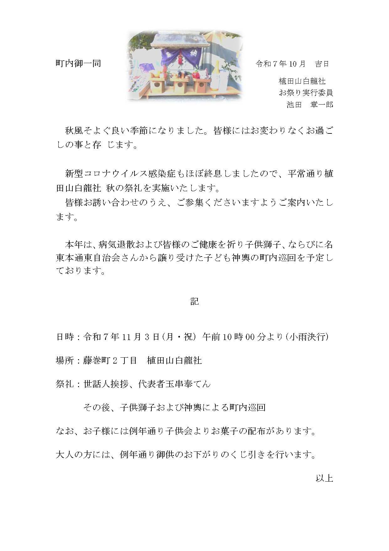 令和7年11月3日 植田山白龍社の秋の祭礼のお知らせ 2025年10月27日 wpmaster 令和7年11月3日(月・祝)午前10時より、下記の通り行います。(少雨決行) お手伝いいただける方は午前8時半に藤巻町集会所へお集まりください。