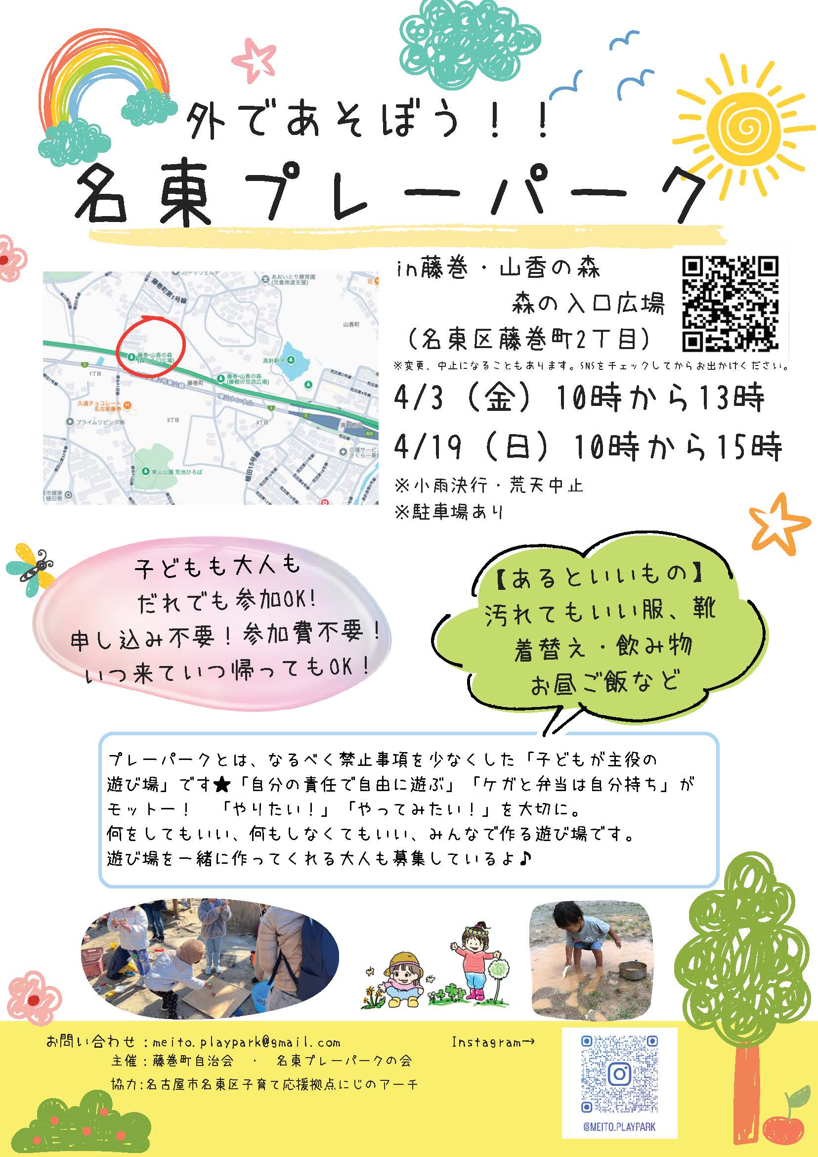 令和8年4月からの名東プレーパークはチラシのように平日と日曜日の月2回開催となります。
